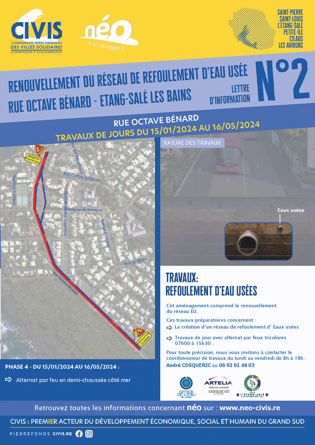 Retrouvez également toutes les informations sur le phasage des travaux 2024 dans la lettre n°9 et sur www.neo-civis.re
